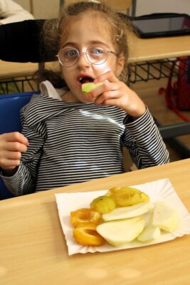 Dzisiaj klasa 1A rozmawiała o owocach jesiennych. Dopasowywaliśmy owoce, nazywaliśmy je wspierając się komunikatorem Mówik. Następnie wykonaliśmy pracę plastyczną – kolorowe słoiki z owocami, nawiązując do jesiennych przetworów. Na zakończenie odbyła się degustacja owoców – mogliśmy spróbować ich smaku i porównać, które najbardziej nam smakują.