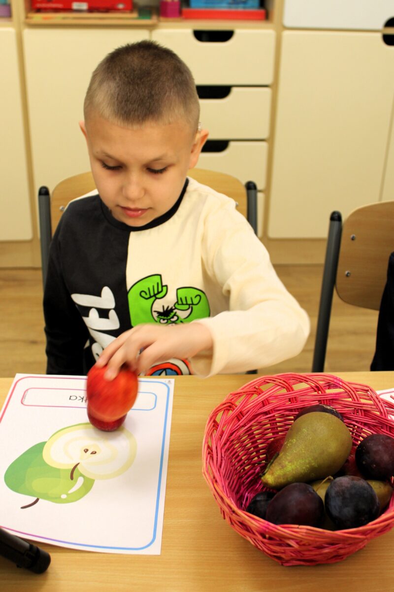 Dzisiaj klasa 1A rozmawiała o owocach jesiennych. Dopasowywaliśmy owoce, nazywaliśmy je wspierając się komunikatorem Mówik. Następnie wykonaliśmy pracę plastyczną – kolorowe słoiki z owocami, nawiązując do jesiennych przetworów. Na zakończenie odbyła się degustacja owoców – mogliśmy spróbować ich smaku i porównać, które najbardziej nam smakują.
