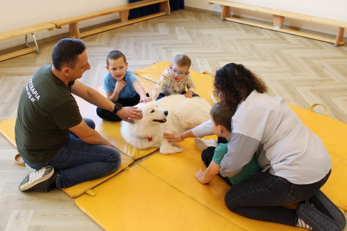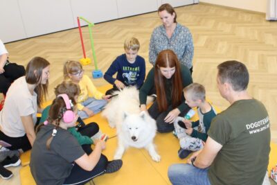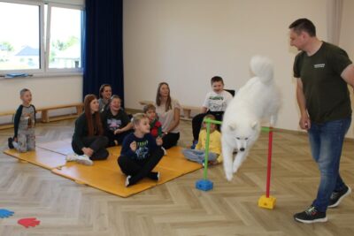 Dziś w naszej szkole odbyły się zajęcia z dogoterapii. Spotkanie rozpoczęło się od przywitania z Juką, głaskania oraz wspólnego wyczesywania jej sierści. Następnie uczniowie mieli okazję przejść przygotowany tor przeszkód razem z naszym czworonożnym przyjacielem. Pan Arek, opiekun Juki, zaprezentował także jej niezwykłe umiejętności – pies skakał wysoko przez przeszkody, wzbudzając zachwyt i gromkie brawa. Na zakończenie zajęć każdy uczestnik mógł nagrodzić Jukę jej ulubionymi smakołykami. Był to czas pełen radości, uśmiechu i wzajemnej życzliwości, a także świetna okazja do nauki odpowiedzialności i szacunku wobec zwierząt.