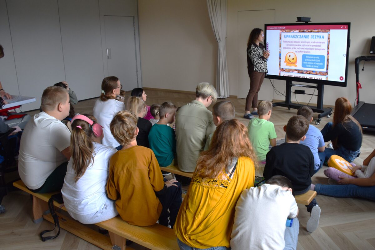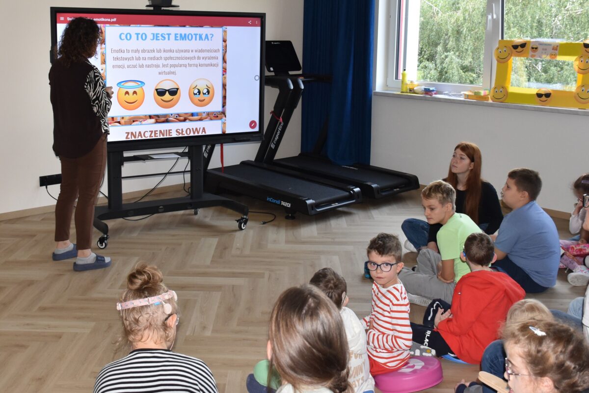 . Uczniowie mieli okazję dowiedzieć się, jak powstały emotikony i jak zmieniały się na przestrzeni lat. Na tablicy interaktywnej czekały na nich ciekawe zadania i quizy, które sprawiły wszystkim wiele frajdy