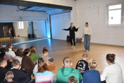 Z okazji Dnia Muzyki i Tańca 🎶 nasza szkoła wybrała się do Studia Tańca „Gossip” w Zduńskiej Woli. Pani Izabela Wartalska serdecznie powitała nas i oprowadziła po całym studiu, prezentując wszystkie cztery sale taneczne. Uczniowie mieli okazję spróbować swoich sił w różnych formach tańca i akrobatyki 🤸♀️. Dużym przeżyciem była możliwość wykonania podstawowych ćwiczeń na rurce oraz na specjalnym kole akrobatycznym. Dzieci z zainteresowaniem próbowały także tańca na długich, wiszących chustach, co dostarczyło im wiele radości. Po aktywnej części zajęć Pani Izabela zaprosiła wszystkich do wspólnego tańca 💃. Uczniowie chętnie dołączyli i z zaangażowaniem odtwarzali elementy choreografii. Na zakończenie wizyty wręczyliśmy Pani Izabeli podziękowanie za gościnność i możliwość poznania różnych form tańca. Wyjście do studia okazało się inspirujące i pełne pozytywnych emocji.