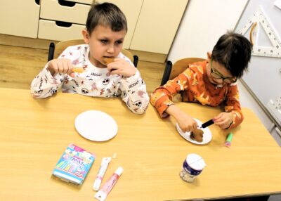 Ostatnie dni w klasie 1a były pełne sensorycznych przygód. Uczniowie tworzyli polarne misie z farb i bibuły, poznawali zapachy, dopasowując je do odpowiednich smaków, a także dekorowali pierniki nasączone cukrem wanilinowym i olejkami zapachowymi. Poznaliśmy również cyfrę 5 — liczyliśmy na konkretach, ozdabialiśmy jej kształt, a na koniec przygotowaliśmy pachnącą masę sensoryczną z mąki, oleju, soli, wody i aromatycznych olejków.