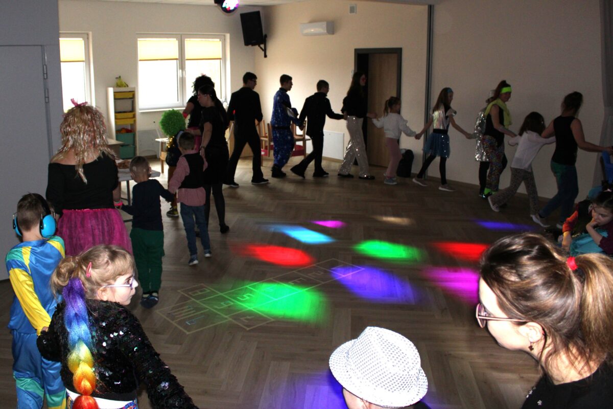Podczas wydarzenia dzieci świetnie bawiły się przy rytmach muzyki disco, biorąc udział w licznych zabawach tanecznych💃. Dużo radości przyniosły również klasyczne gry, takie jak zabawa w klasy, które wprowadziły dodatkowy element ruchu i śmiechu.