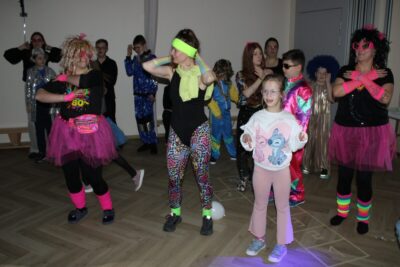 Na uczniów czekał także pyszny poczęstunek 🍪🍎, który pozwolił zregenerować siły przed kolejnymi tańcami. Wspólny taniec, śmiech i barwne stroje sprawiły, że bal stał się niezapomnianym wydarzeniem 💛 Sala udekorowana w klimacie retro 🌈 dopełniła całości i przeniosła wszystkich w wyjątkowy świat lat 80🙂