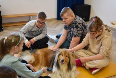 Podczas wczorajszych zajęć z dogoterapii uczniowie tradycyjnie rozpoczęli spotkanie od przywitania się z Lucy 🤗 poprzez głaskanie i delikatne wyczesanie jej sierści 🪮. Taki spokojny początek pomaga w budowaniu więzi z psem oraz przygotowuje dzieci do dalszej aktywności.