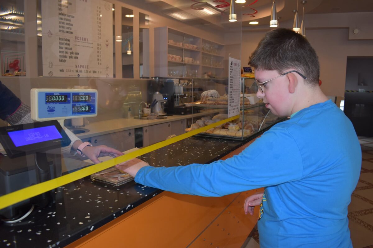 W Naszej szkole w klasie I i II uczniowie sumiennie usprawniają czynności dnia codziennego. Podejmują działania samodzielnego robienia zakupów, wykonywania posiłków oraz korzystania z miejsc publicznych takich jak w tym przypadku, cukiernia
