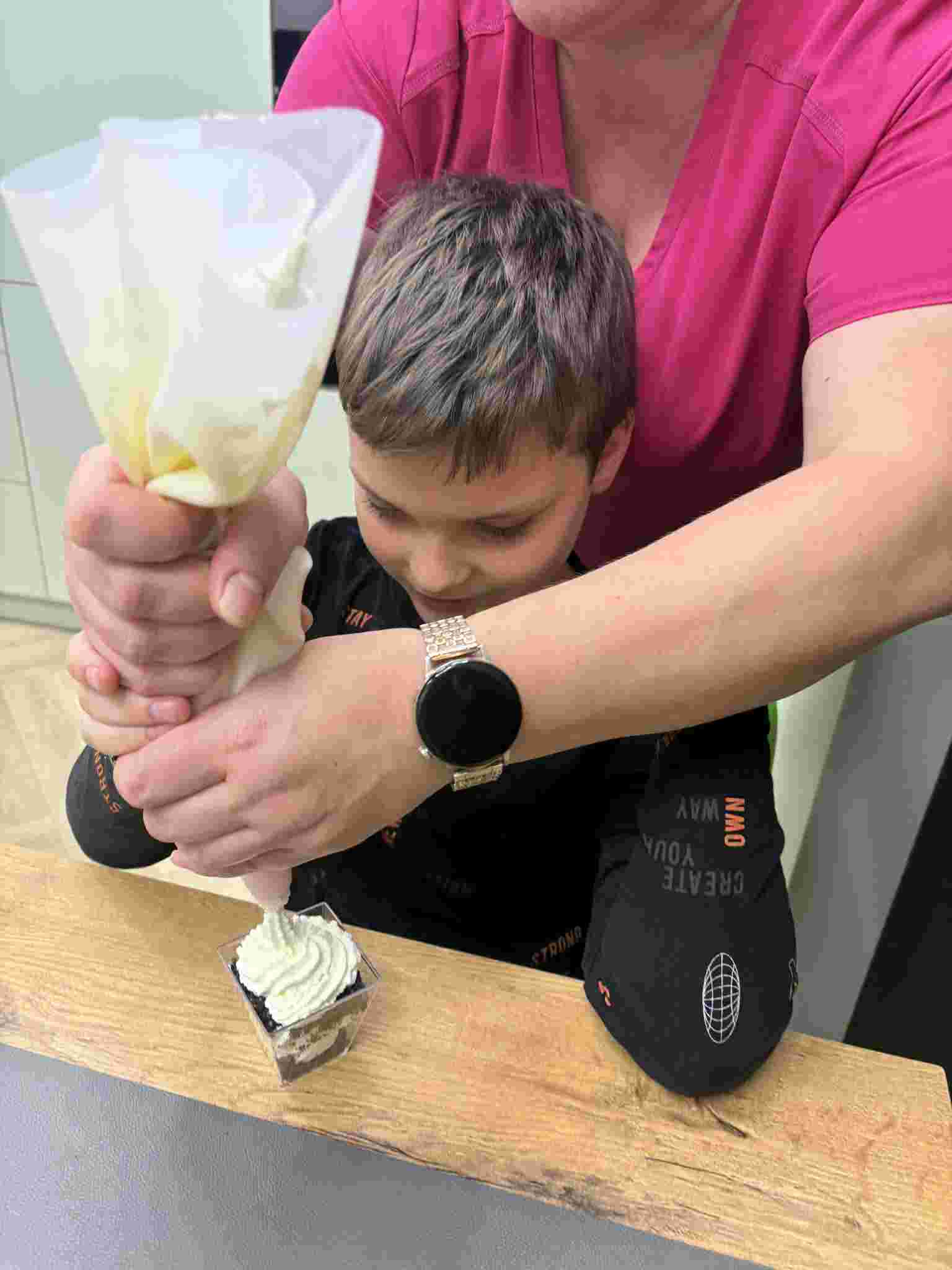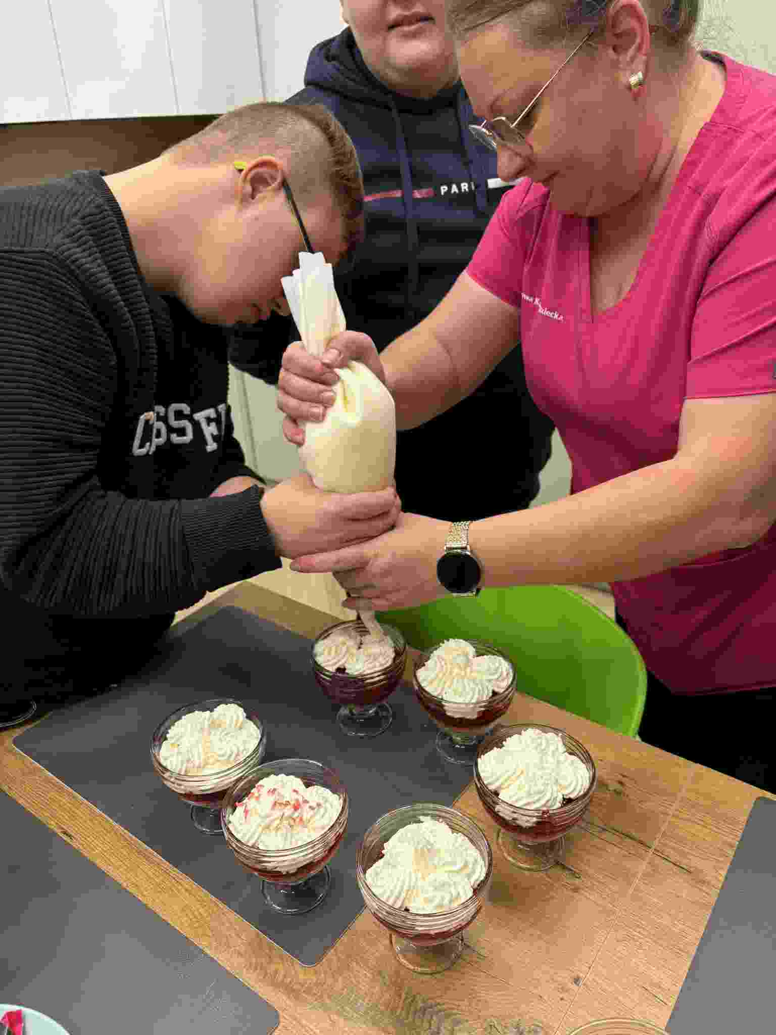 Jednym z etapów było warstwowe komponowanie deserków – uczniowie z dużą starannością układali składniki, dbając o estetykę i porządek pracy. Każdy deser był przygotowany z sercem. Zajęcia sprzyjały nie tylko nauce prostych czynności kulinarnych, ale także współpracy, samodzielności i budowaniu pozytywnych emocji.