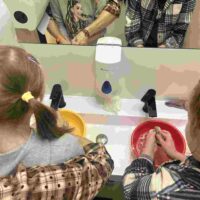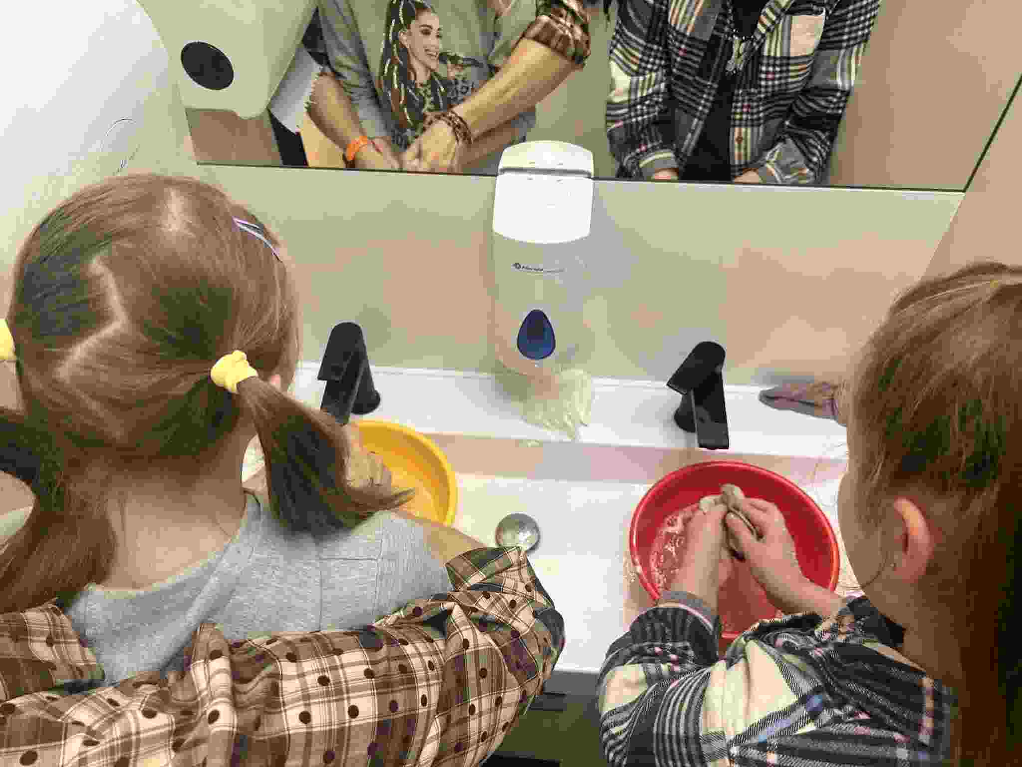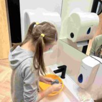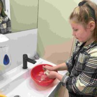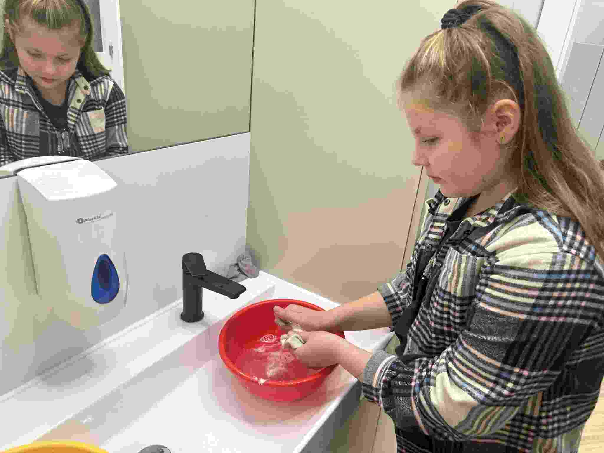 Podczas treningu umiejętności w życiu codziennym uczniowie uczą się podstawowych czynności dnia codziennego. Na jednych z zajęć dziewczynki uczyły się jak wyprać ręcznie bieliznę np. skarpetki. Pomimo świadomości, iż każdy ma w domu pralkę, która może wykonać te prace za nas. Dzieci dowiedziały się, że można wyprać zabrudzone rzeczy nie mając takiego urządzenia. Najpierw zobaczyły jakie etapy czynności po kolei trzeba wykonać, a następnie samodzielnie nalały wody do miski, namoczyły zabrudzone rzeczy, prały i na koniec wypłukały. Zajęcia rozwijały samodzielność, sprawność manualną, koordynację wzrokowo-ruchową oraz kształtowały nawyki dbania o higienę osobistą.