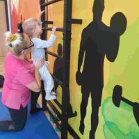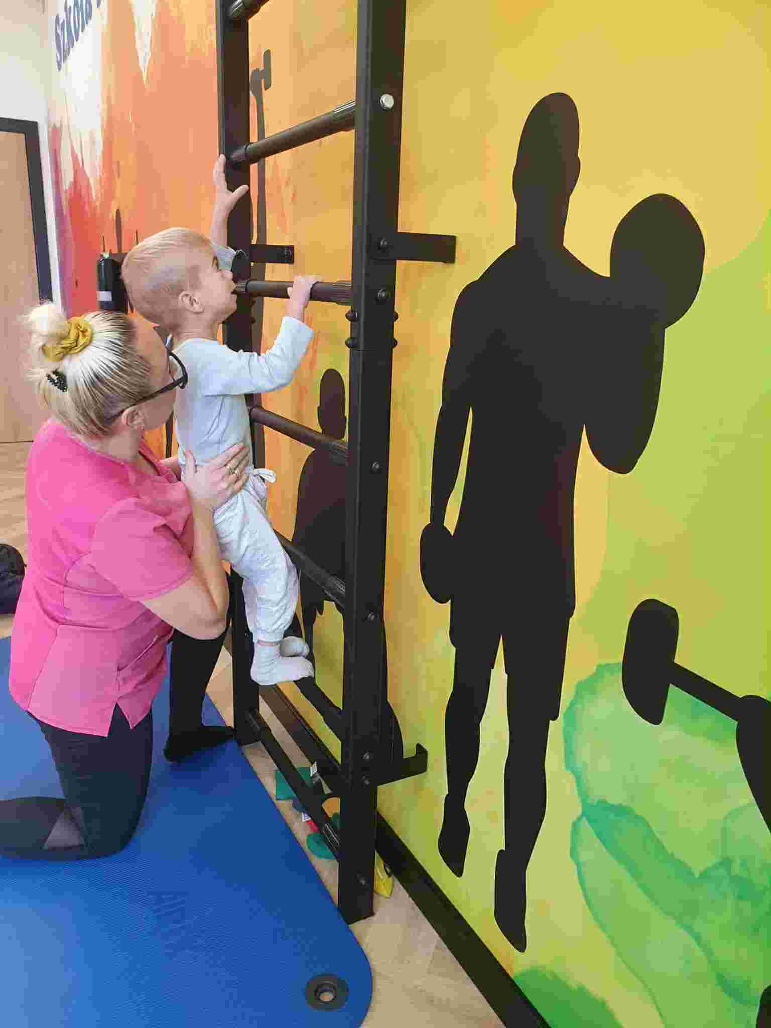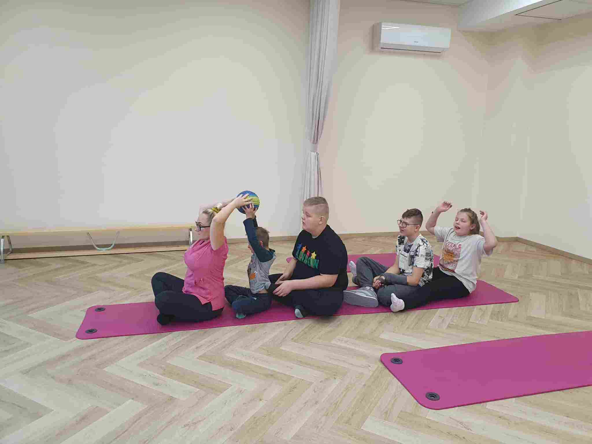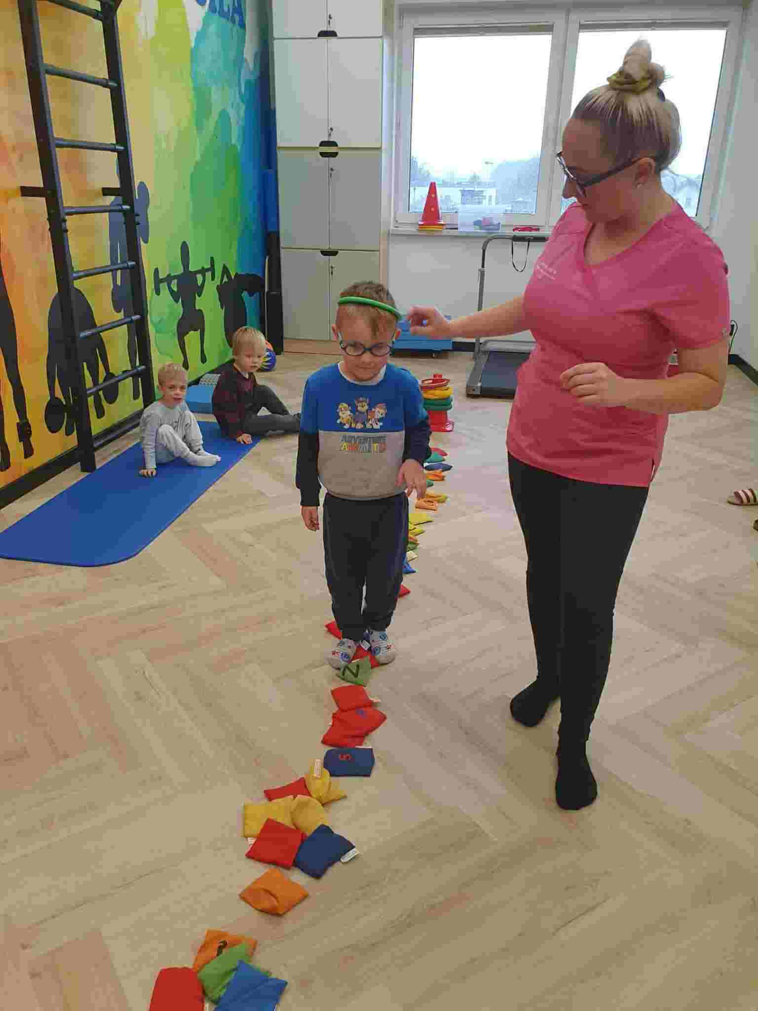 Młodsza grupa w ramach aktywności pokonywała kolorową ścieżkę sensoryczną, co sprzyjało doskonaleniu równowagi, koordynacji oraz koncentracji. Nauczyciel wspierał dzieci, pokazując im, jak prawidłowo stawiać kroki i utrzymać stabilną postawę. Na koniec najmłodsze dzieci z dużym zaangażowaniem testowały naszą nową drabinkę