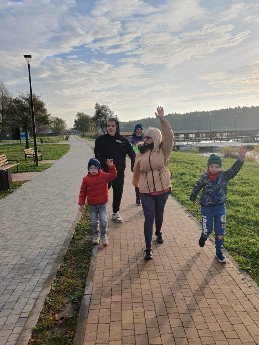 wykonując skłony, krążenia ramion, wymachy nóg oraz ćwiczenia oddechowe. Ruch na świeżym powietrzu sprawił im wiele radości, poprawił ich samopoczucie i dodał energii.
