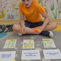 W ramach jednych z zajęć „Uczę się pilnie” uczeń rozwijał umiejętność porządkowania zdarzeń, a także rozpoznawanie i nazywanie emocji. Uczniowi zostały przedstawione dwie krótkie historyjki obrazkowe. Zadaniem chłopca było układanie obrazków według kolejności zdarzeń na podstawie czytanego tekstu przez terapeutę. Dopasowanie odpowiednich buziek z emocjami do wyrazu twarzy postaci z historyjki. Następnie zaprezentowanie własnej emocji rysunkiem na balonie, a także ćwiczenie wyrazów twarzy w lustrze.
